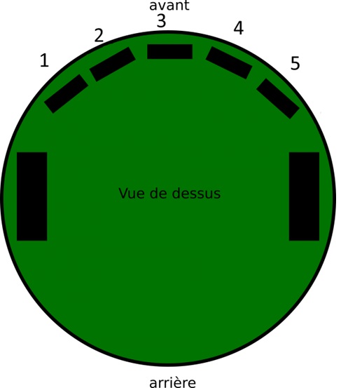 Voici une vue de de dessus du robot et le placement des cinq capteurs à l’avant du robot :